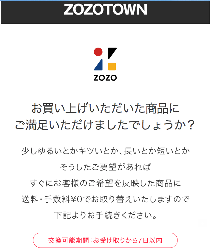 ZOZOスーツで計測して注文したので、返品・交換が出来ないと思いきや、受け取りから7日以内なら送料・手数料無料で取り替えてくれるのです。